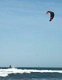 A veces surgen contratiempos, y en un momento el barrilete de Eduardo rozó la superficie del mar y decidió quedarse allí; luego de unos diez minutos de lucha con el aparejo, nuestro amigo pudo lograr que el "kite" levantara vuelo y así proseguir con su "surf" a toda velocidad.